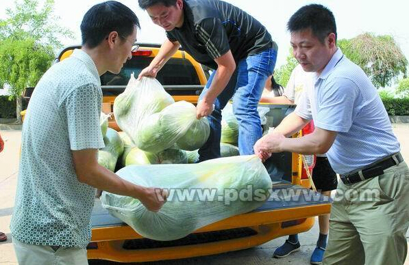 7月26日,平頂山燃?xì)夤镜膯T工將500公斤西瓜、100公斤綠豆以及清火茶等防暑降溫用品,送到了市自來(lái)水公司白龜山水廠冒著高溫保供水的一線員工手中。本網(wǎng)記者李英平攝