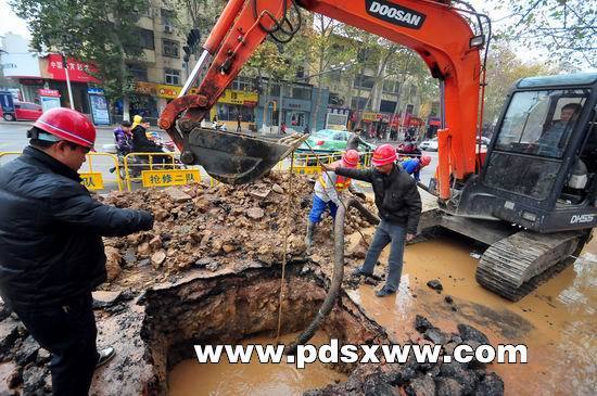 當天,這里的一根管徑為300毫米的供水主管道爆裂,大量清水涌出路面,為了不影響附近2000多戶居民用水,搶修人員帶水作業(yè),迅速進行維修。本報記者禹舸攝